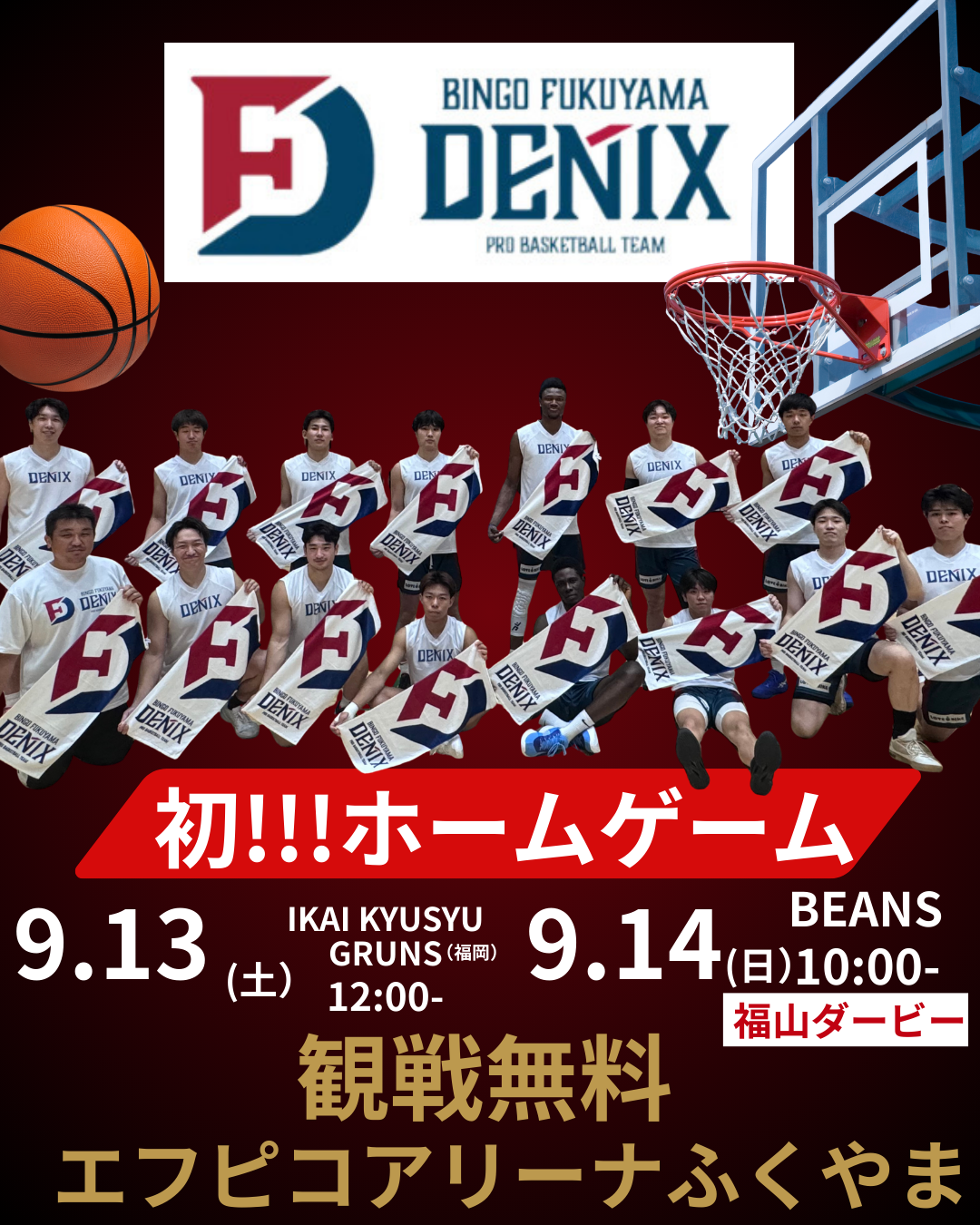 初めてのホームゲームで、将来Bリーグへ参入できた時に、『あの時が始まりだったよね』と語り継がれる試合になるでしょう。◾️観戦無料 ◾️冷房完備 ◾️アリーナ駐車場2時間無料 ◾️試合は1時間程度 ◾️先着でデニックスからプレゼントあり